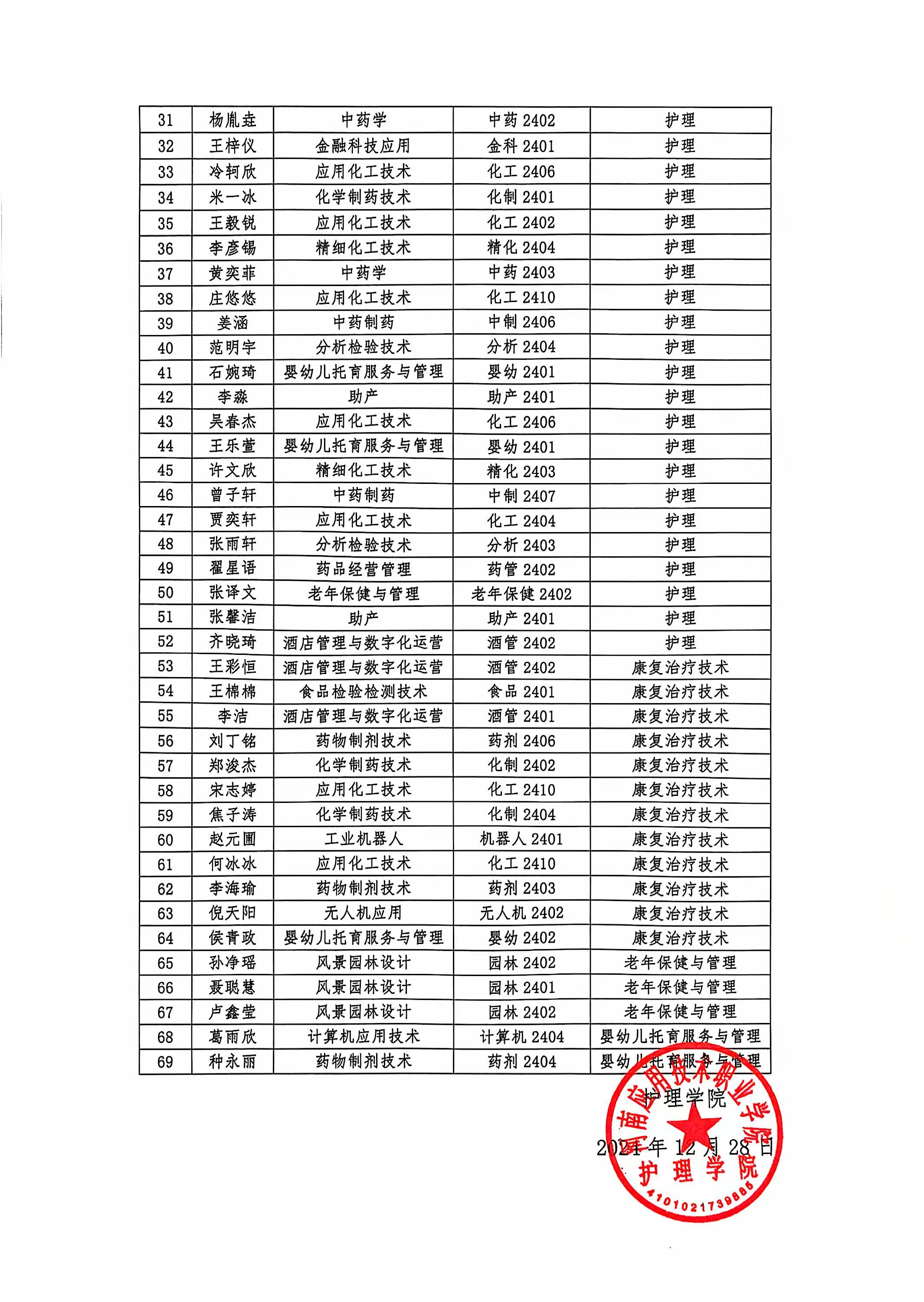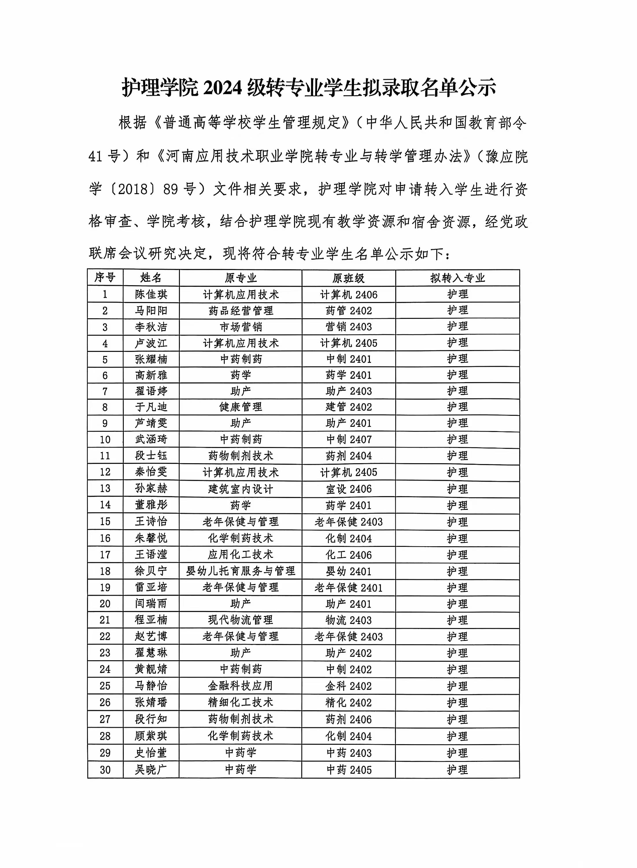 护理学院2024级转专业学生拟录取名单公示