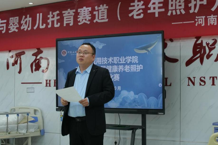张忠勇书记指出,健康养老照护兼具职业属性与社会责任,需专业技能与 “爱心、耐心、责任心” 并重。他提到学院坚持 “技能 + 素养” 双培养,希望赛事能锤炼学生本领、坚守职业初心,同时感谢评委支持与师生筹备,预祝选手发挥最佳水平。