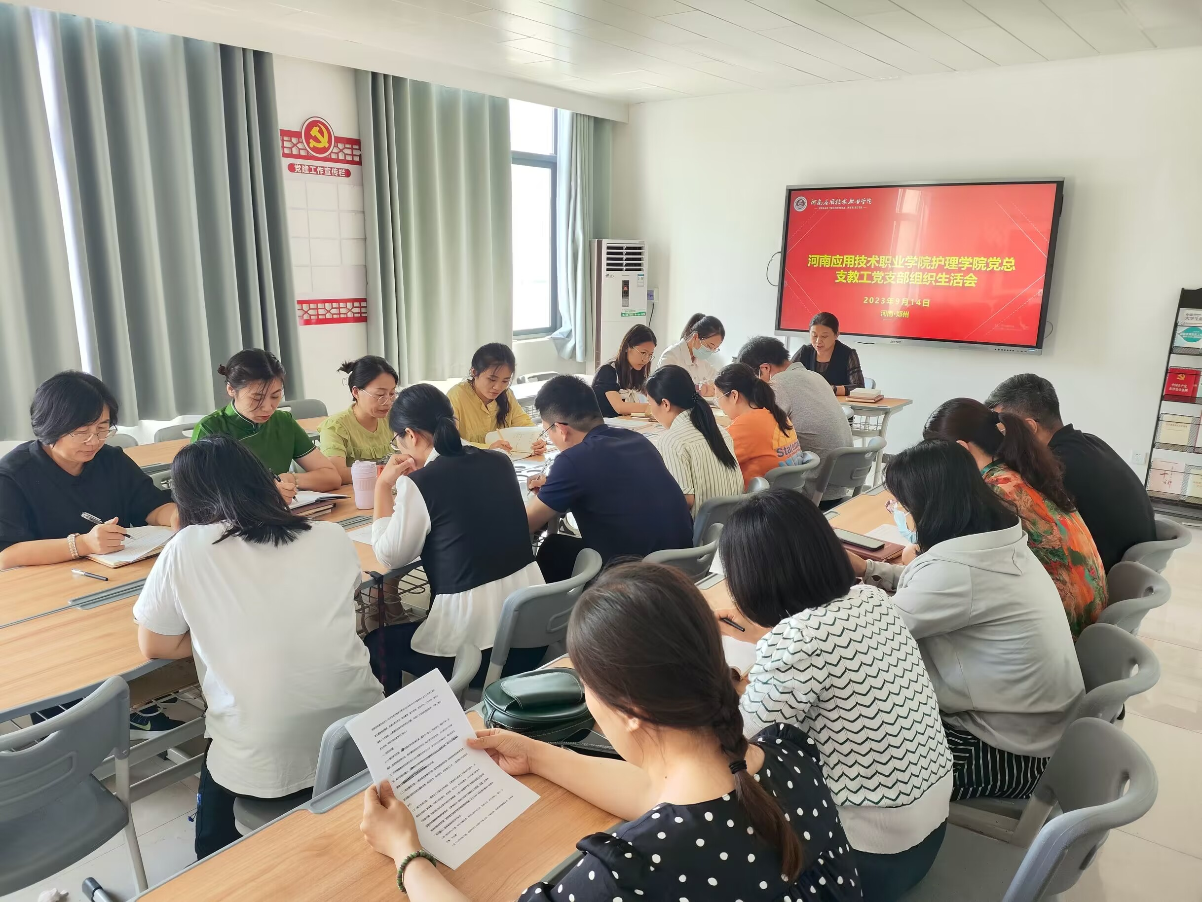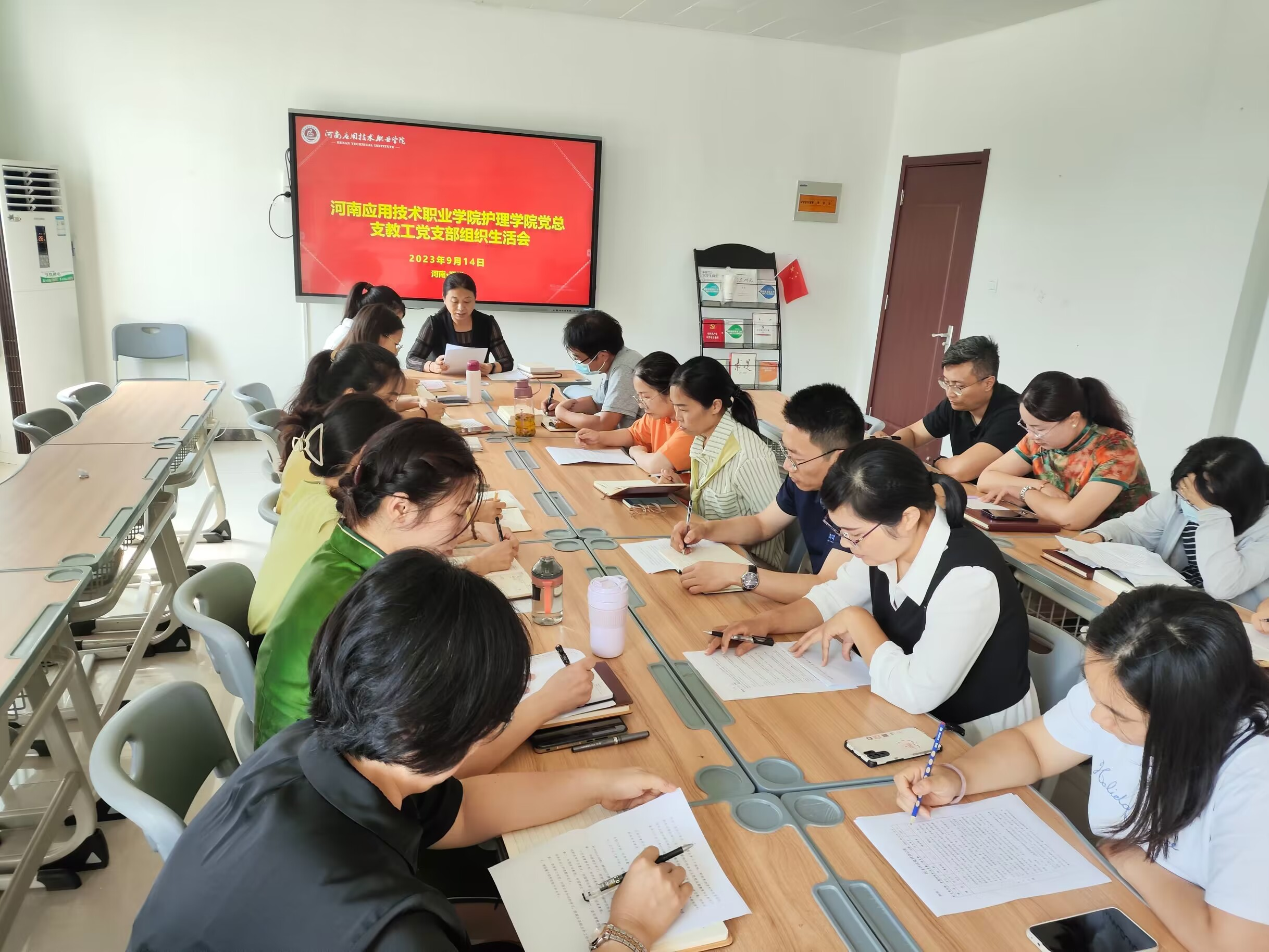 会议由教工党支部书记王风云同志主持。王风云同志首先带领教工党支部党员教师认真学习习近平总书记关于以学铸魂、以学增智、以学正风、以学促干的重要讲话精神。接下来由王风云同志报告教工党支部主题教育工作开展情况。河南应用职业学院护理学院教工党支部现有20名教工党员,在学校党委的正确领导下,始终以高度的政治责任感,把抓好学习贯彻习近平新时代中国特色社会主义思想主题教育作为当前首要政治任务,紧紧围绕学校“立德树人”的工作目标,加快学校的“双高”建设和精神文明建设,构建和谐校园,推动学校高质量发展。教工党支部教师们能够严格遵守党的纪律,自觉维护党的领导,保持廉洁自律,严格遵守教育部关于师德禁行行为。护理学院教工党支部通过强化政治理论学习不断提升教师党员思想政治意识及党性修养,积极组织教师参加各项技能比赛及企业实践提升党员教师学校及社会服务能力,开展多项职业技能培训项目打造“技能服务型”样板教工党支部,聚焦师生热点问题深入调查研究并及时整改落实到位,深入贯彻学习习近平新时代中国特色社会主义思想,不断推动主题教育在护理学院高质量推进,高质量落实。会议第三项由教工党支部党员同志围绕学习贯彻习近平新时代中国特色社会主义思想主题,聚焦学思想、强党性、重实践、建新功总要求,结合党员教师具体工作情况,深入检视查摆问题,开展严肃批评与自我批评,真正把职责摆进去、把思想和工作摆进去查找不足,明确整改方向。