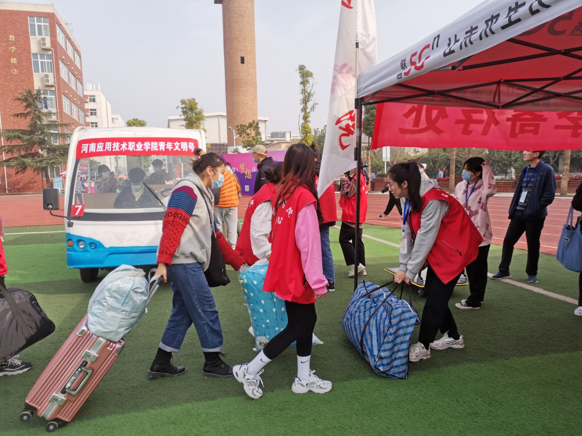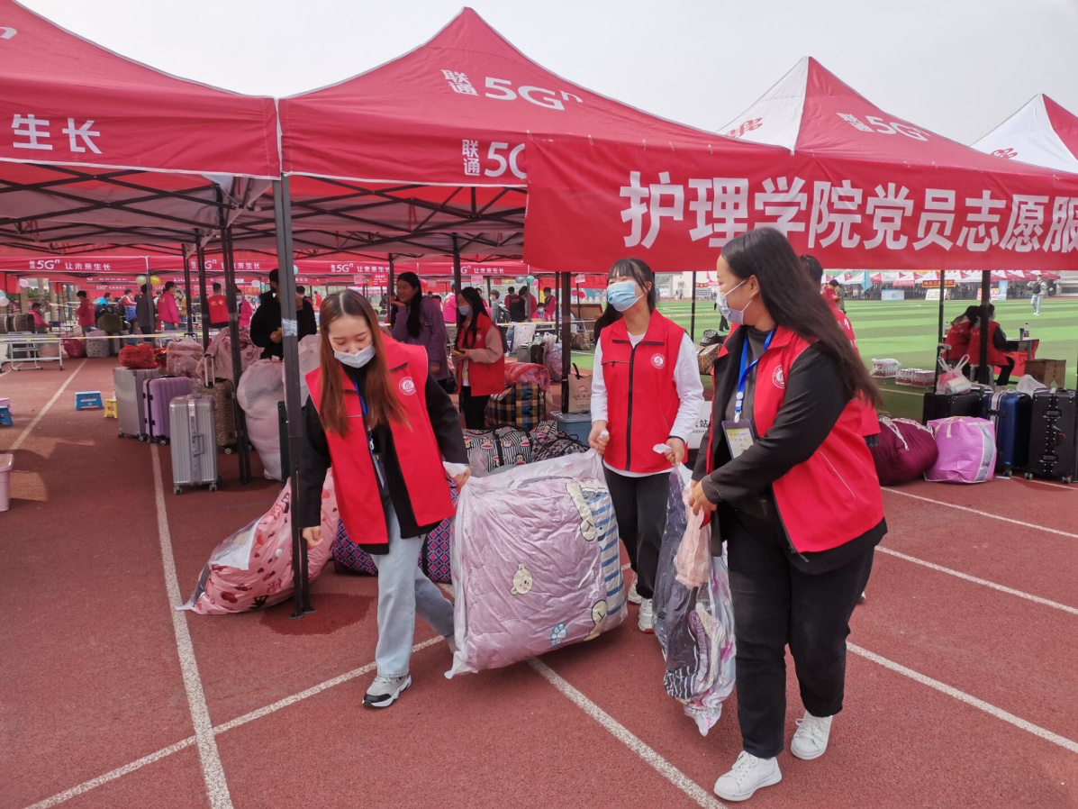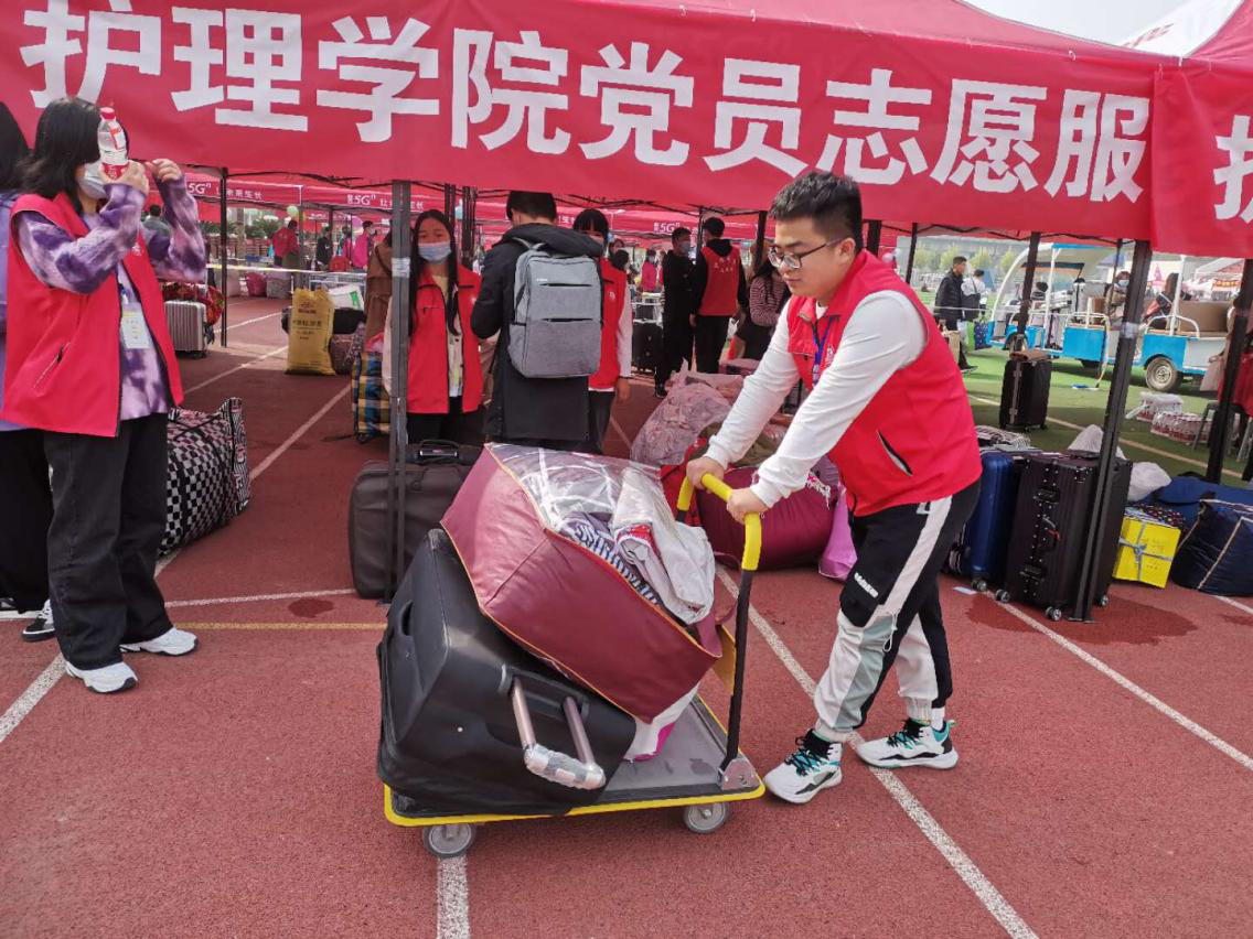 迎新前,护理学院设立了党员志愿服务站和行李寄存处。报到时,学生家长不允许进入学校,新生分别从东门、南门错时错峰报到入学。迎新期间,志愿者热情地引导新生到学院迎新点,主动帮助新生运送行李、办理报到手续,耐心地解答新生的困惑和问题。来来回回的接送工作也并没有使志愿者们懈怠于自己的工作,他们热心的欢迎每一位新生的到来,让刚踏入大学校园的新生们感受到了不一样的温暖。