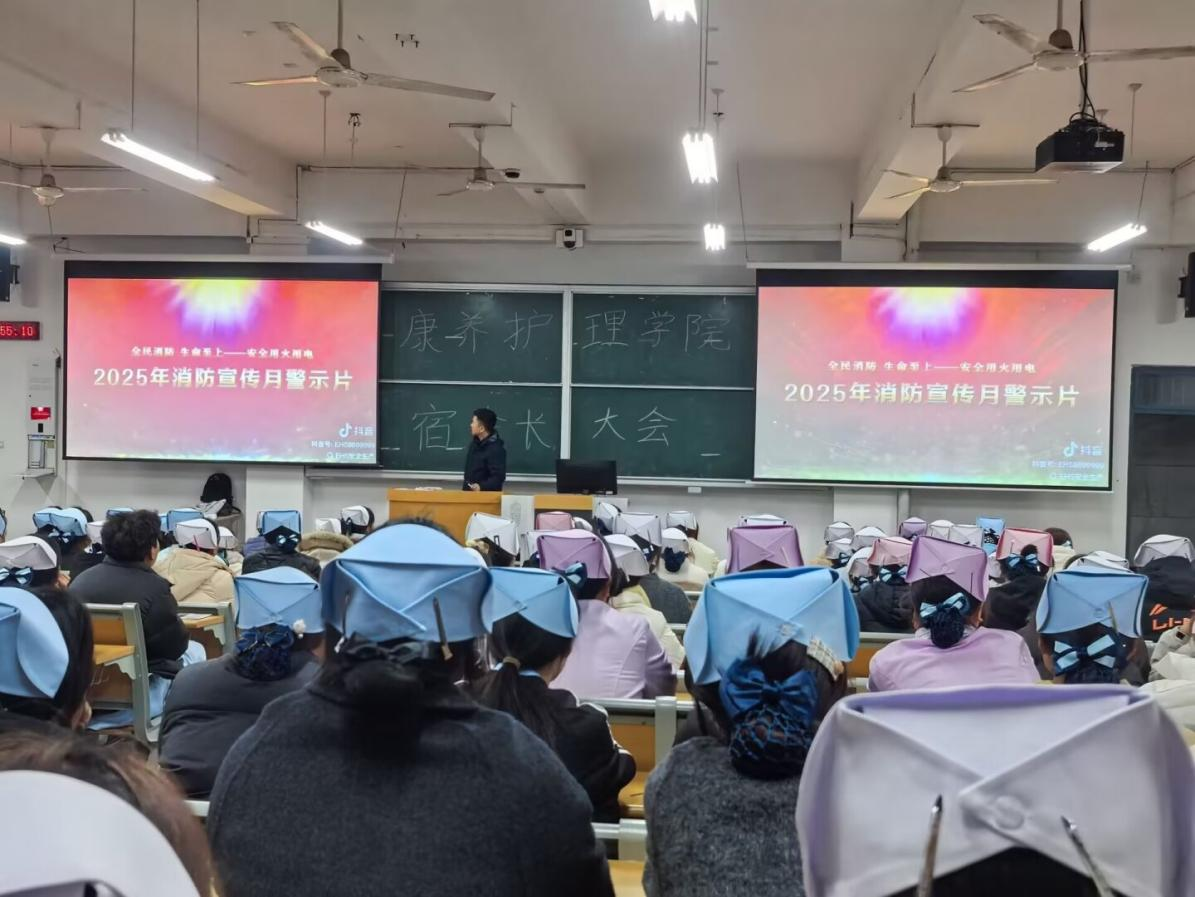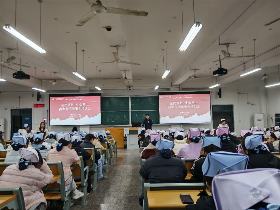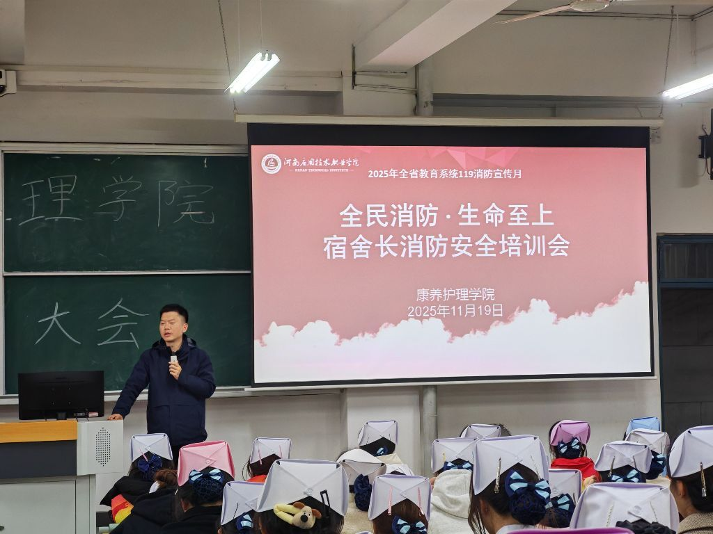 培训会上,梁海洋结合校园生活场景,以近年来典型火灾案例为切入点,从宿舍电器使用安全、公共区域消防设施识别,到火情发生时的正确报警流程与自救要点,通过图文结合的方式,将抽象的安全知识转化为易懂的实用内容。梁海洋强调,康养护理专业的特殊性,要求大家不仅要呵护生命健康,更要具备“防患于未然”的安全素养,宿舍内违规电器的一次侥幸,公共区域消防设施的一次忽视,都可能酿成无法挽回的风险。希望大家以典型案例为镜,把安全规范刻在心上、落在行上,主动成为校园安全的“监督员”。