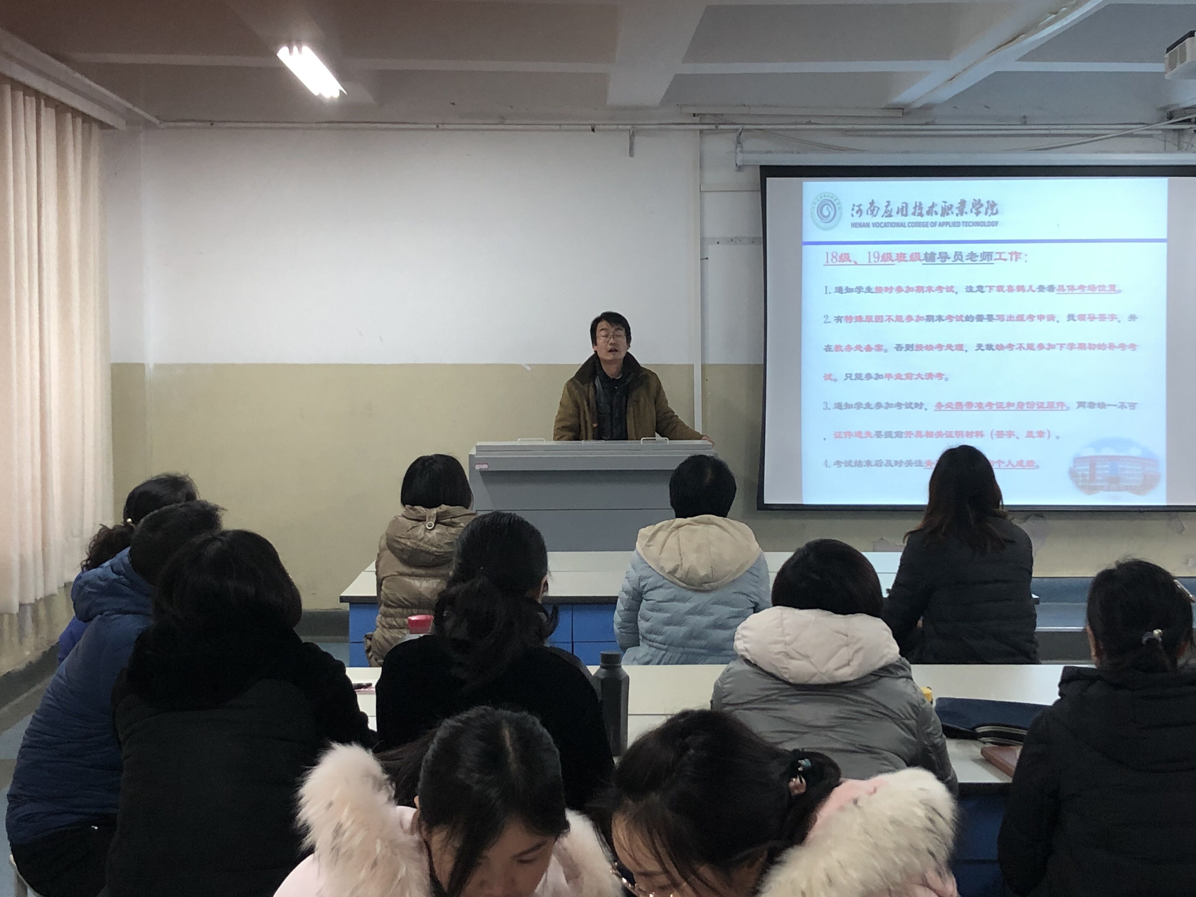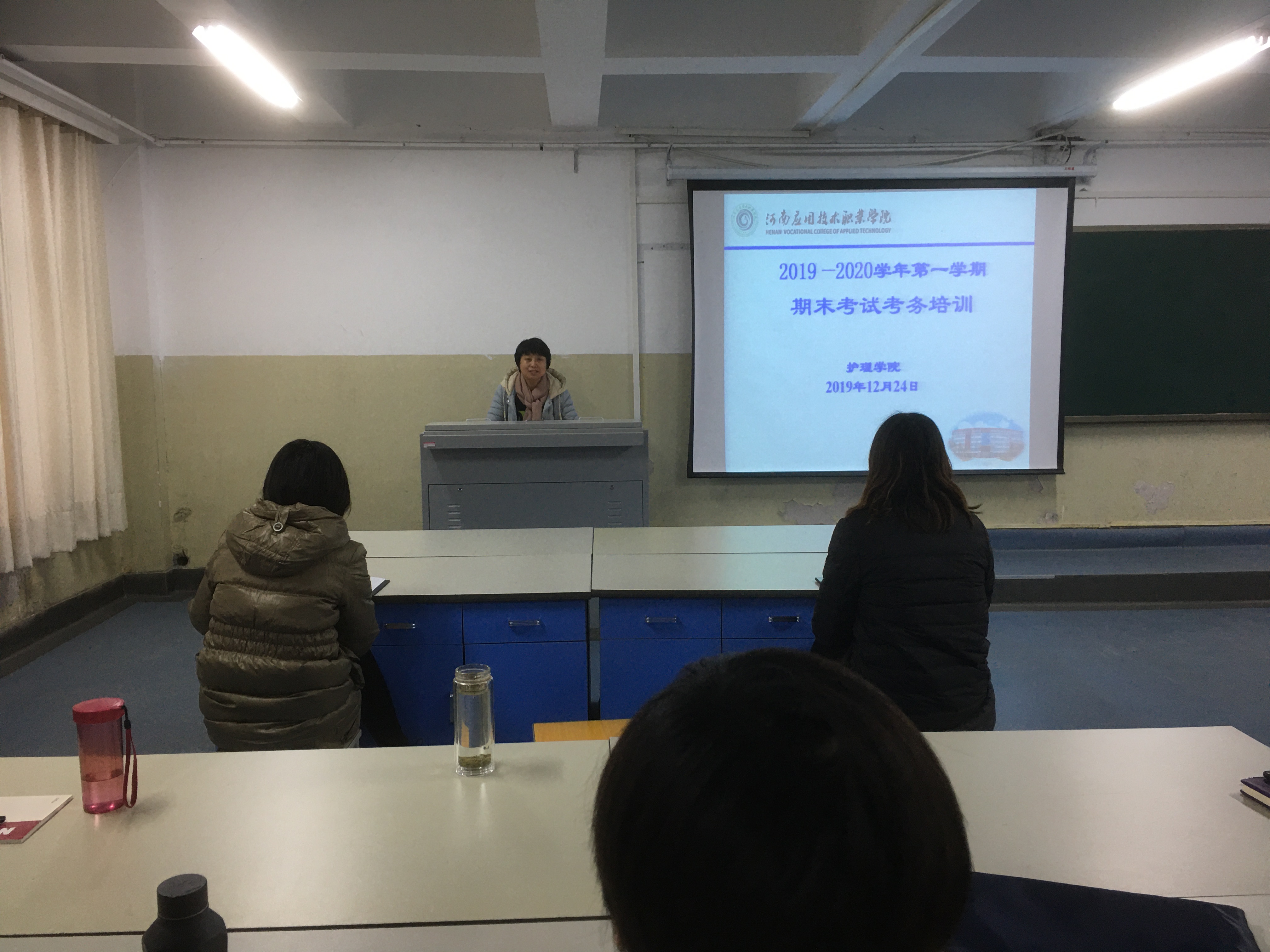 2019-2020学年第一学期期末,为了迎接即将到来的学期期末考试,加强考务管理,严肃考试纪律,规范期末考试监考工作和考务工作流程、职责。营造公平、公正的考试环境,杜绝违反考场纪律现象,保证期末考试顺利进行。根据学校教务处工作安排,2019年12月24日,护理学院在学校D楼207室,召开期末考试考务工作培训会。陈永惠副院长主持会议,护理学院全体教师和基础教学部部分教师出席了本次培训会议。
