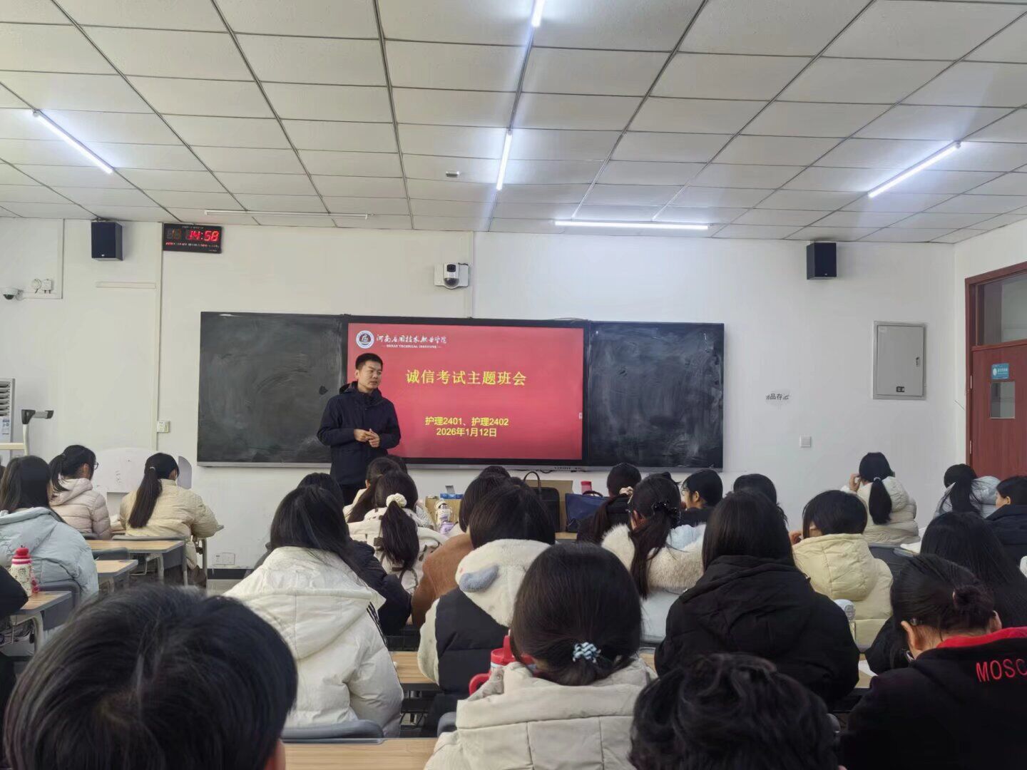 各班级结合学生特点精心设计班会流程,内容充实且针对性强。辅导员们首先围绕期末考试纪律要求,详细解读了《学生考试违纪作弊处理办法》,通过典型案例分析,直观展示了作弊行为对个人学业、诚信档案及未来发展的严重影响,在互动交流环节,学生们围绕 “诚信考试”“诚信做人” 展开热烈讨论,分享了自己对诚信的理解与感悟。部分班级还组织学生签订《诚信考试承诺书》,以庄重的仪式感强化责任意识,承诺在考试中坚守底线、杜绝作弊。