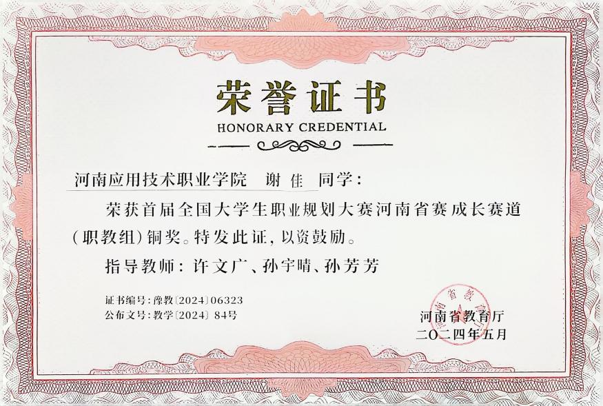 同时,她极具规划意识与创新思维,积极参与各类竞赛,在首届大学生职业规划大赛中,凭借清晰的定位、详实的规划与出色的临场表现,从众多参赛者中脱颖而出,荣获省赛铜奖,展现了对职业的深刻理解与长远规划。